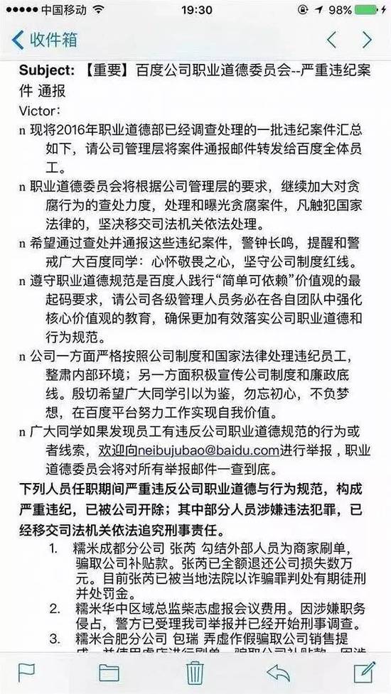 2016年9月,百度共列举了17起内部严重违纪案件,总计通报开除共30名员工。涉及的罪名包括为商家刷单、骗取公司补贴款、虚报会议费用、占据推广费、与合作伙伴大额往来、篡改搜索排名、受贿、弄虚作假冲业绩等各种名目。百度的“纪委”最为出名的“政绩”,是2016年4月以“违反职业道德、损害公司利益”为由,查处了百度副总裁、有“推广之父”之称的王湛,随后2016年11月,百度最年轻的副总裁李明远因在某收购案中有私下巨额经济往来,违反了百度职业道德规定,最终离开了百度。