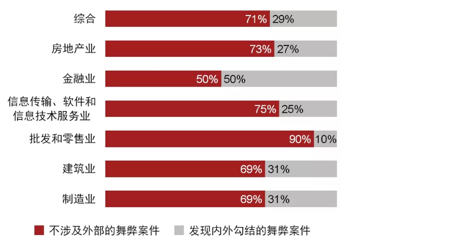 总体来看,企业舞弊案件中约70%为纯内部人员舞弊,比例超过内外勾结作案的两倍。