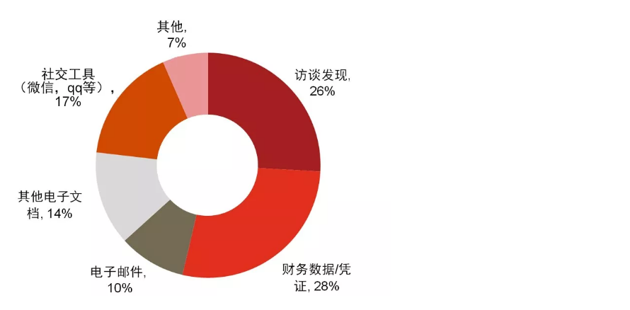 随着企业业务的日益信息化,在舞弊调查中获取的电子证据日益增多,也越发重要。舞弊案件的直接证据来源中,电子证据占比已经占到约40%,包括社交工具 (17%) 、电子邮件 (10%)以及其他电子文档(14%)。