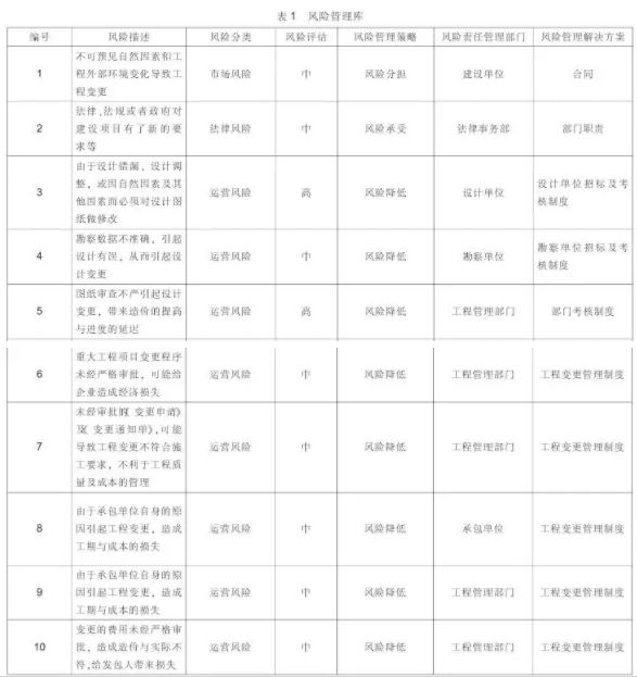 需要说明的是市场瞬息万变,施工现场复杂多变,引起变更的原因也不胜枚举,因此风险管理是一个不断持续的过程,风险库也是一个不断更新与增项的过程,在具体风险过程管理的时候需要带有更多的前瞻性与预测性才能真正将风险的影响降至最低。