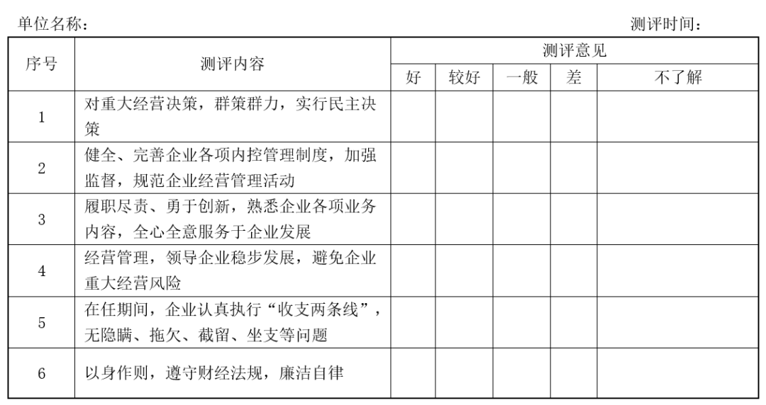 1.抽调公司组织人事部、企业管理部门有关人员召开会议,宣读离任领导干部述职报告,进行民意测评。按评定的要素,以领导干部守法、守纪、守规、尽责情况为重点,以领导干部任职期间本单位财政收支、财务收支以及有关经济活动的真实、合法和效益为基础”,具体涵盖科学经营决策、遵纪守法、履职尽责、经营管理、财务收支、廉洁自律等主要六个方面,分别以(好、较好、一般、差、不了解)五个等次,由参加测评人员选择。测评时单位领导应当回避,并以不记名填表方式进行。测评后,由审计组进行统计,并将统计结果纳入到审计结果的评价之中。