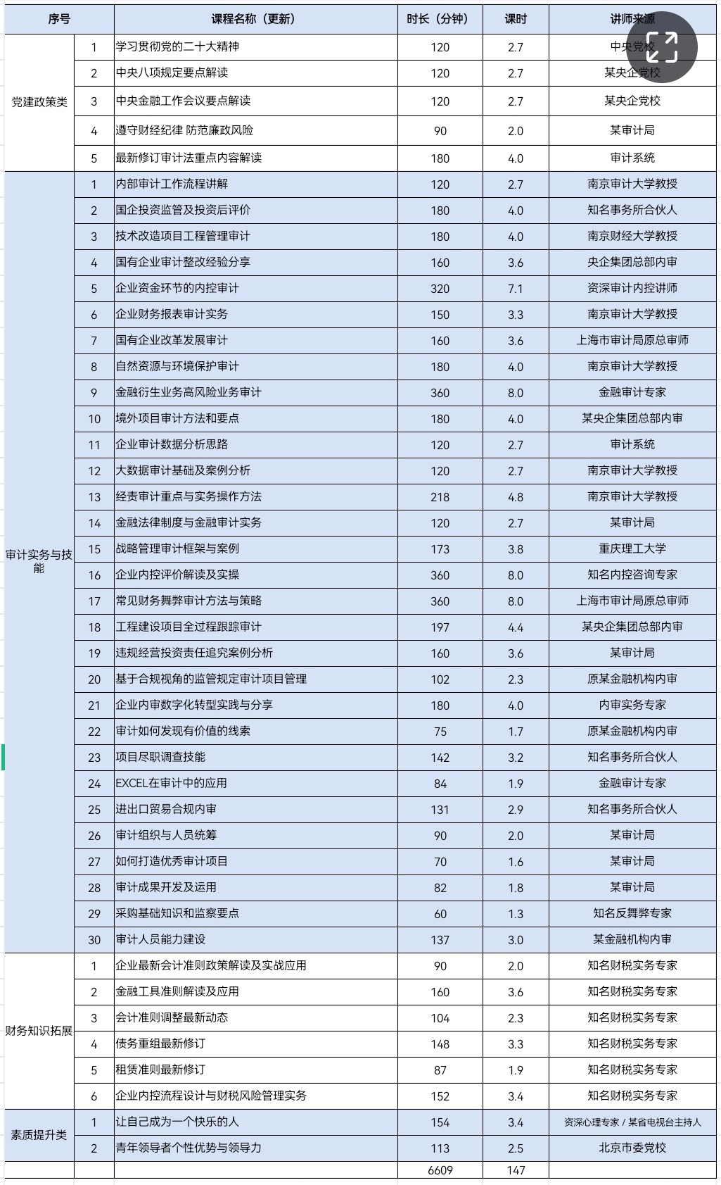 课程由 南京审计大学教授、国家部门审计专家、大型央企及行业知名咨询机构实务大咖共同打磨;内容涵盖最新政策解读、审计实务实操、监管要求多个维度和领域, 共计43门课程(目录详见附件),合计达147课时,支持电脑、手机端学习,且可持续反复学习 365天,学习结束自动发放 【内审精英证书】。