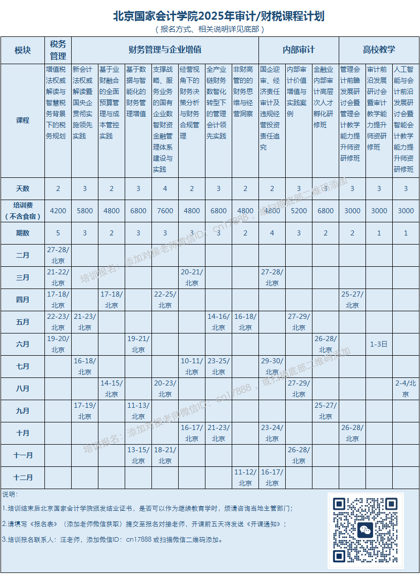 | 课程 | 增值税法权威解读与智慧税务背景下的税务规划 | 新会计法权威解读暨国央企贯彻实施领先实践 | 基于业财融合的全面预算管理与成本管控实践 | 基于数据与智能化的财务管理增值 | 支撑战略、服务业务的国有企业数智财资金融管理体系建设与实践 | 经营视角下的财务决策分析与财务合规管理 | 全产业链财务数智化转型下的管理会计领先实践 | 非财高管的的财务思维与经营洞察 | 国企迎审、经济责任审计及违规经营投资责任追究 | 内部审计价值增值与实践案例 | 金融业内部审计高层次人才孵化研修班 | 管理会计前瞻发展研讨会暨管理会计教学能力提升师资研修班 | 审计前沿发展研讨会暨审计教学能力提升师资研修班 | 人工智能与会计前沿发展研讨会暨智能会计教学能力提升师资研修班 |