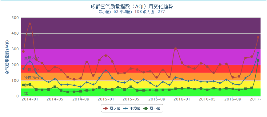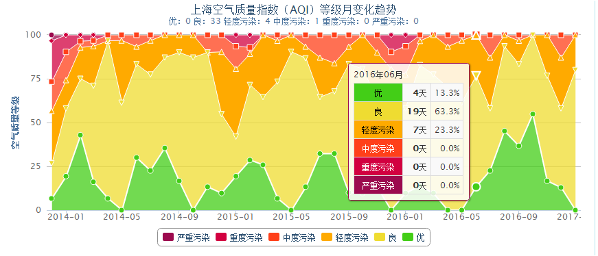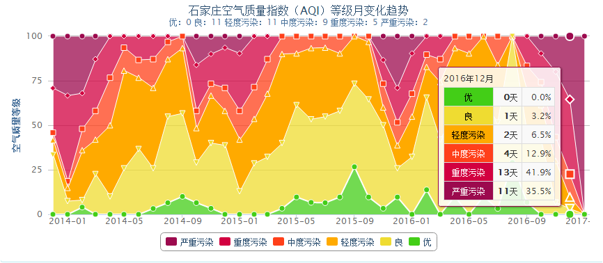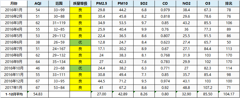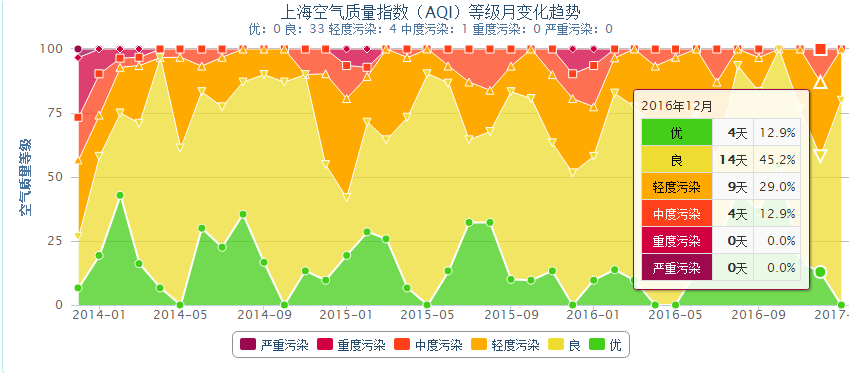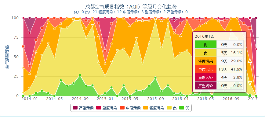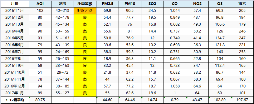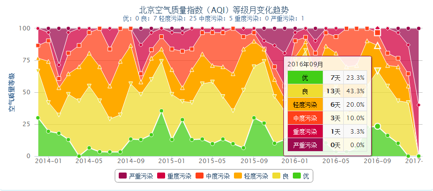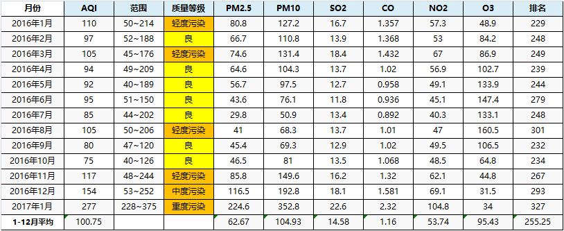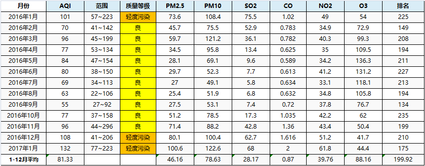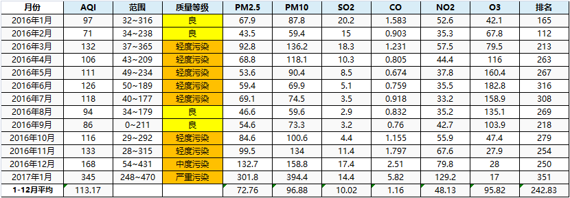 ▶ 本文数据时间跨度:2016年1月1日至2017年1月5日,数据维度:空气质量指数(AQI)最大值、最小值、平均值,优、良、轻度污染、中度污染、重度污染、严重污染天数
