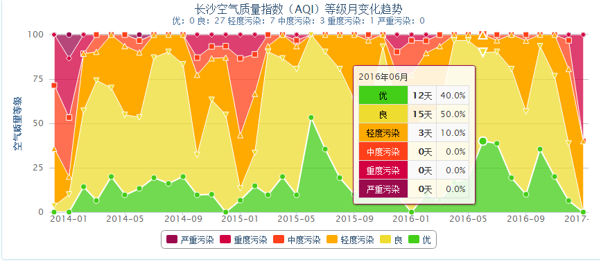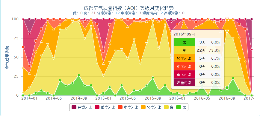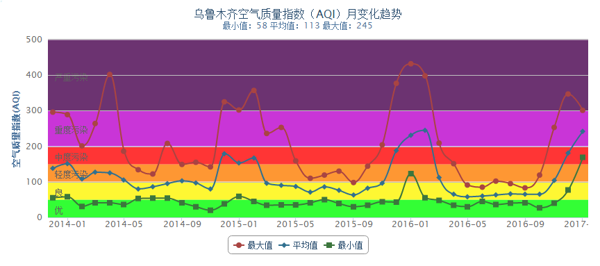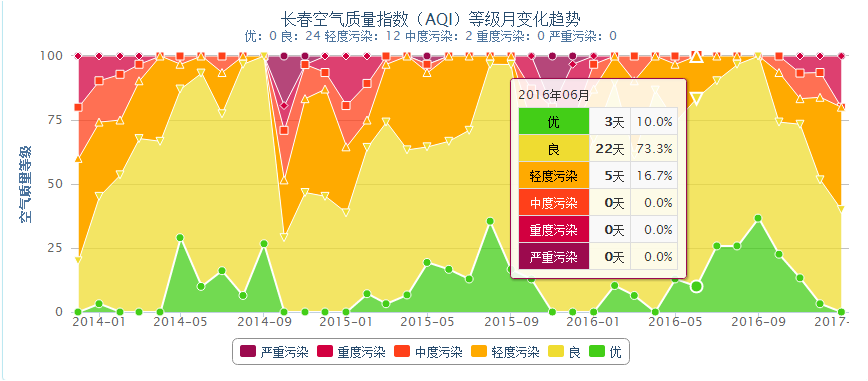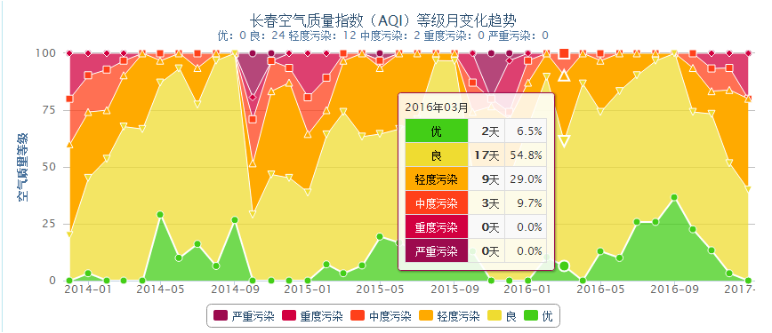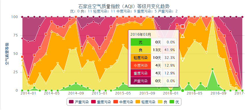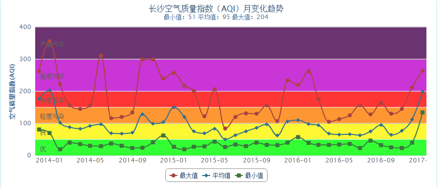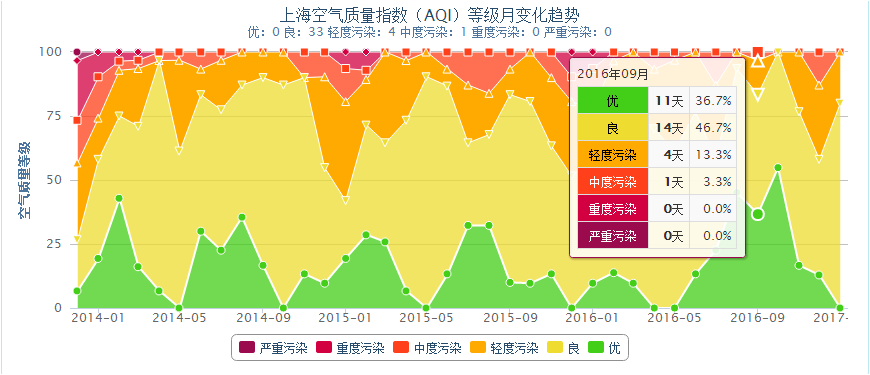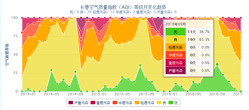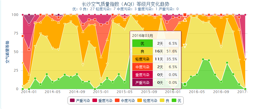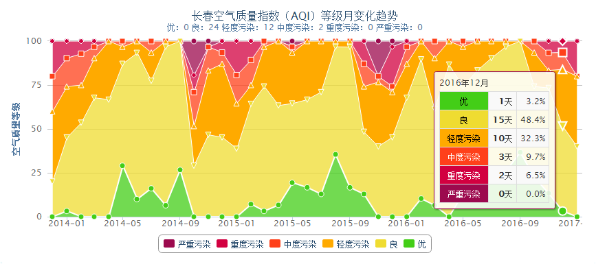 ▶ 本文数据时间跨度:2016年1月1日至2017年1月5日,数据维度:空气质量指数(AQI)最大值、最小值、平均值,优、良、轻度污染、中度污染、重度污染、严重污染天数