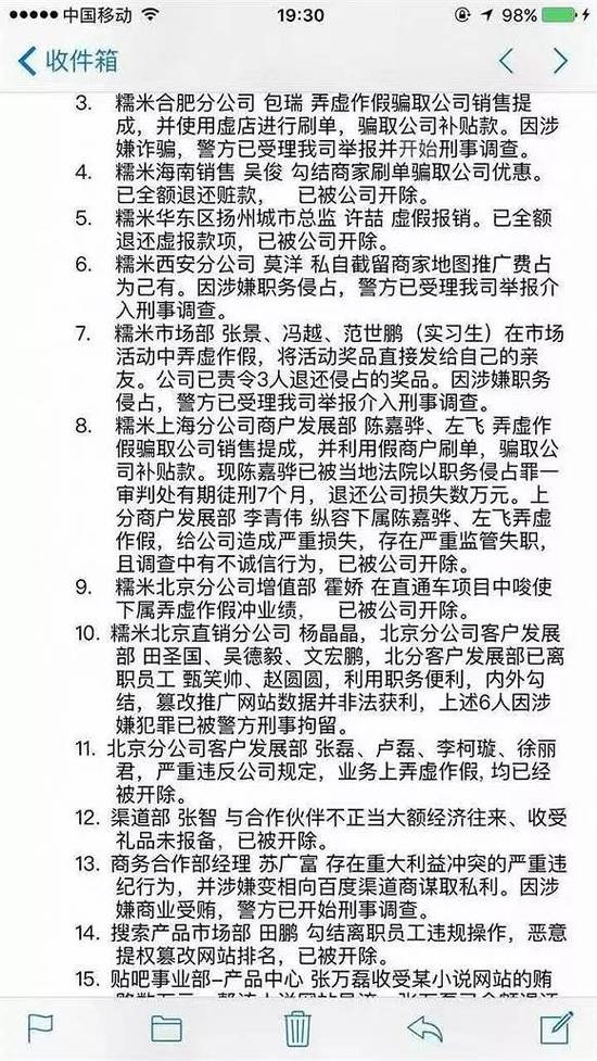 2015年,百度通过一封名为《打造阳光职场,做简单可依赖的百度人》的内部邮件,向全体员工通报了“阳光职场”行动查处的,涉嫌职务侵占、商业受贿等重大职业道德违规行为的8名员工。